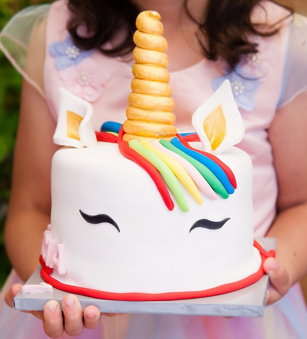 Para la decoración la cubrimos con fondant blanco, sobre el que se hizo una colorida cabellera en Fondant y por supuesto lo elementos típicos del unicornio; cuerno y orejas.